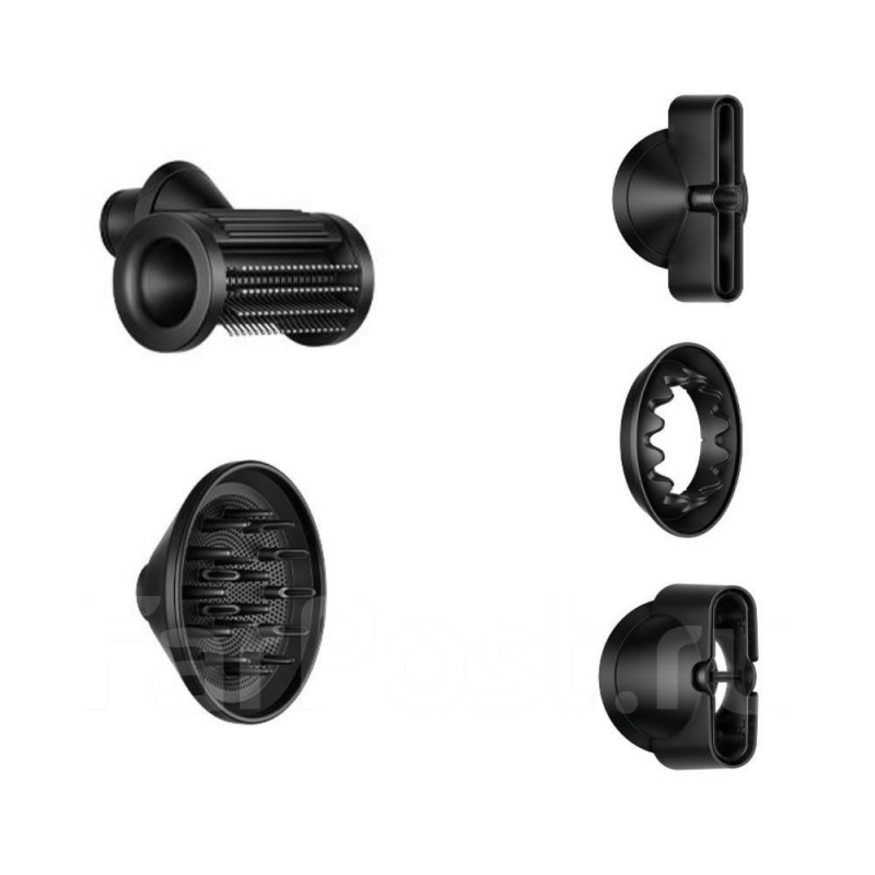 Фен с пятью насадками: противоскользящая насадка для выпрямления волос, насадка для направленного воздушного потока, концентратор для точной укладки, диффузор для объёма и текстуры, а также насадка для бережной сушки волос. |